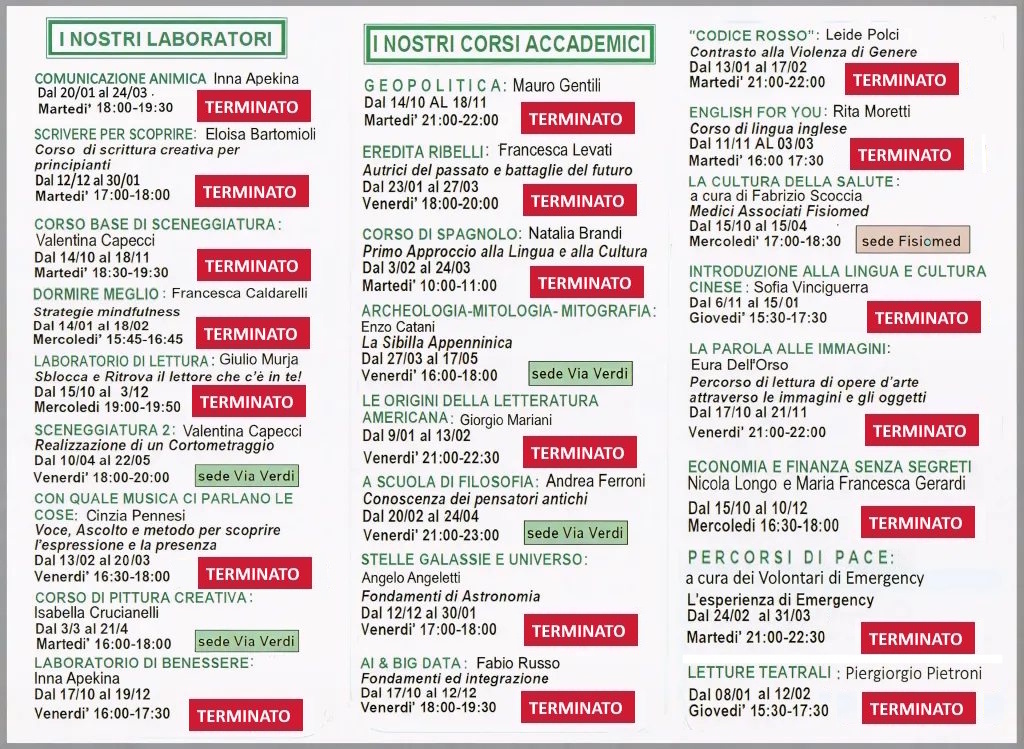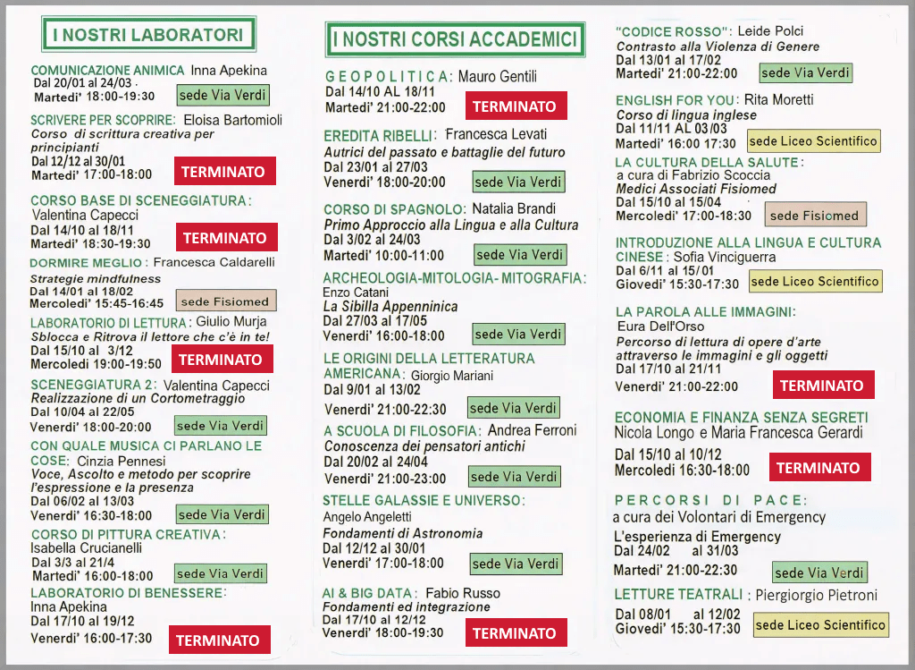 Lezioni, corsi e laboratori potrebbero, eccezionalmente, subire cambiamenti a fronte di eventi imprevedibili. Verrà data comunque tempestiva informazione.