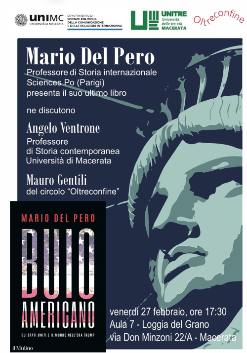 Venerdi’ 27 febbraio alle 17,30 presso la Loggia del Grano, aula 7, Mario del Pero, professore di Storia Internazionale e di Storia della Politica Estera Statunitense al Centre d’Histoire dell’Istituto di Studi Politici di Parigi, Sciences Po, presenta il suo libro “Buio americano. Gli Stati Uniti e il mondo nell’era Trump” un saggio lucido e spietato, dove l’autore racconta come l’ascesa di Donald Trump riveli la crisi profonda dell’identità americana, tra polarizzazione, disuguaglianze e declino democratico. Un’analisi imprescindibile per capire l’America di oggi e il nostro futuro. Ne discuteranno Angelo Ventrone, Professore di Storia contemporanea all’università di Macerata e il Vice Presidente di Unitre Mauro Gentili, esperto di Geopolitica.