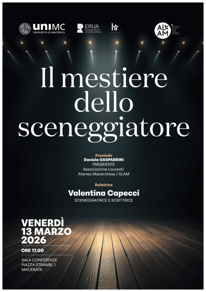 Venerdi’ 13 marzo 2026, alle ore 17.00 presso la Sala Conferenze di Piazza Strambi, 1 a Macerata, la nostra docente Valentina Capecci, scrittrice, docente di sceneggiatura applicata e format TV, sceneggiatrice RAI e Mediaset e per il cinema, sarà la relatrice di un incontro sul tema “IL MESTIERE DELLO SCENEGGIATORE”, sotto l’egida dell’Associazione Laureati Ateneo Maceratese / ALAM , la cui presidente Daniela Gasparrini sarà moderatrice.