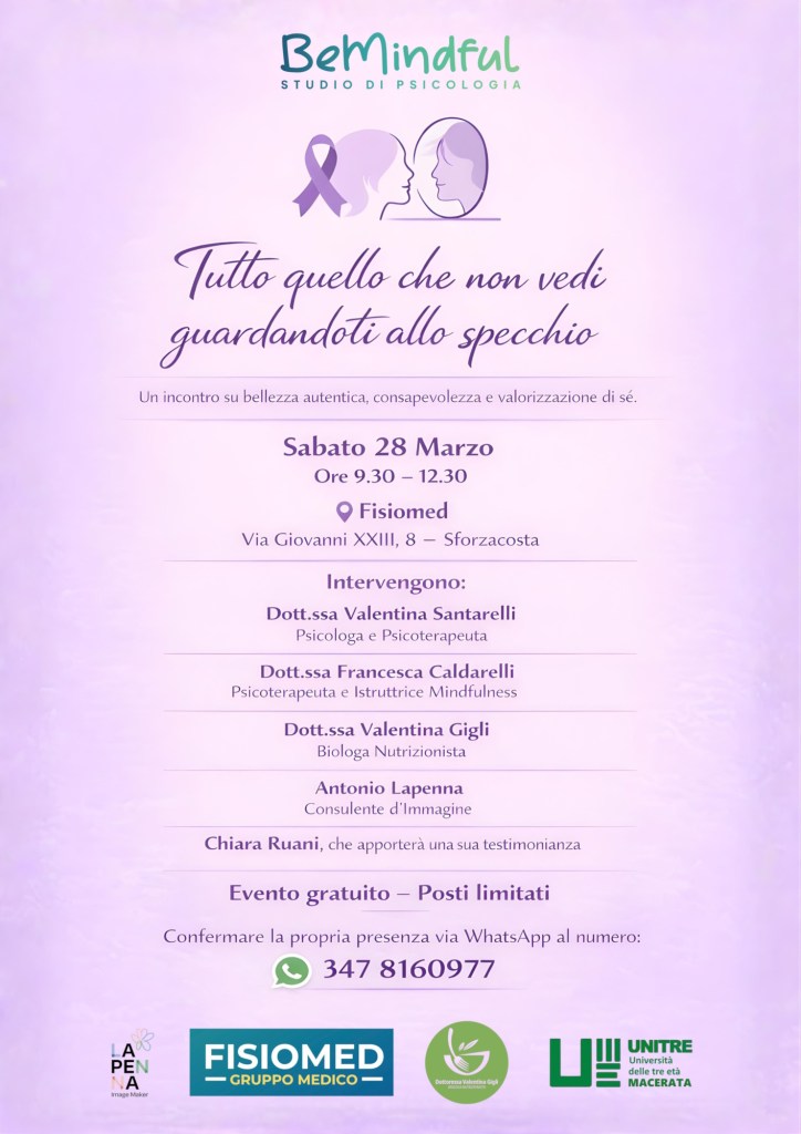 L’evento si svolge in occasione della Giornata del Fiocchetto Lilla sulla sensibilizzazione dei disturbi alimentari, per riflettere insieme sul rapporto con il corpo, l’autostima e il benessere.